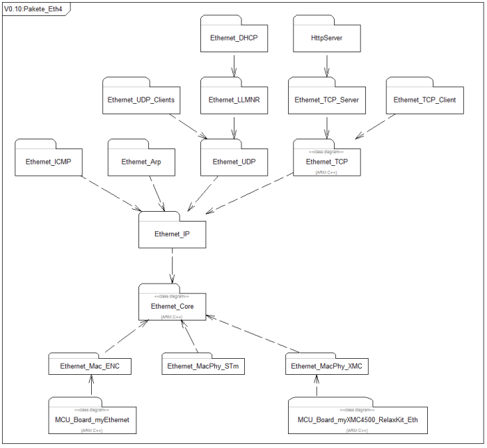 Für das PEC Framework (Portable Embedded Classes) wurde speziell eine IP-Stack UML-Implementation realisiert. Diese zeichnet sich dadurch aus, dass das ISO/OSI Referenzmodell in einer entsprechenden Paketstruktur abgebildet und das TCP Protokoll als Zustandsmaschine modelliert sind.