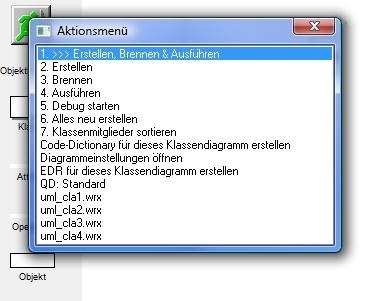 Gehen Sie zurück in das Klassendiagramm der Applikation. Wenn Sie die Zeile richtig eingegeben und das Modell korrekt erstellt haben, können Sie aus dem Klassendiagramm, wie gehabt, den Quellcode generieren, diesen übersetzen und auf den Controller übertragen. Das erfolgt über das Aktionsmenü in der Objektbibliothek. Wählen Sie dort den Menüpunkt Erstellen, Brennen & Ausführen.