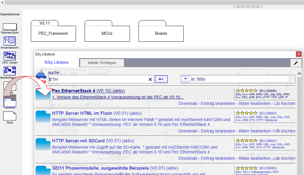 Als erstes muss das Ethernet-Paket zum bestehenden PEC-Projekt geladen werden. Dazu müssen Sie ggf. zurück in die oberste Ebene gehen (rechte Maustaste / nach oben oder einfach Taste ESC). Ziehen Sie aus der Objektbibliothek das Element „LibStore“ in das Diagramm. Suchen Sie im Online-LibStore nach „Eth“