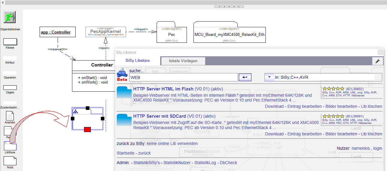 Spezielle Boardordner haben den Vorteil, dass die spezifische Hardware schon funktionsfähig konfiguriert ist. Sie können also sofort loslegen und sich die gewünschte Serverkomponente aus dem Libstore laden. Ziehen Sie aus der Objektbibliothek das Element LibStore in das Diagramm. Suchen Sie im Online-LibStore nach Web oder nach Server.