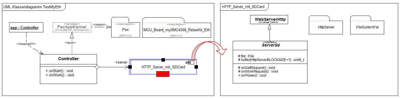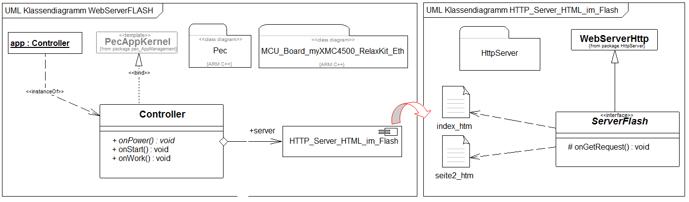 Die erste Lösung soll ein embedded WEB-Server sein dessen HTML-Seiten im FLASH-Speicher des Mikrocontrollers liegen. Damit können wir kleine Systeme aufbauen die auf eine SD-Karte als Speichermedium verzichten. Verbinden Sie die geladene Komponente HTTP Server HTML im Flash über dem Kantentyp Aggregation mit der Klasse Controller.