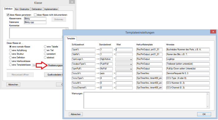 Die Klasse Blinky vereinigt die Merkmale eins Timers und eines Ausgabe-Pins. Die konkreten Ressourcen zur Realisierung wurden ebenfalls als Templates angebunden. Mit der Operation onTimer wurde der Servishandler für den Timer-Interrupt realisiert. Die mittels der Templates zugewiesenen Realisierungsparameter kann man sich über den Definieren-Dialog ansehen.