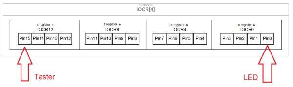 Für den Taster sollten wir uns nochmals die Position im IOCR-Registerblock vergegenwärtigen. Die entsprechende Konfiguration muss auf die Position des Pin1.15 in PORT1.IOCR12 gebracht werden. Dazu beauftragen wir den C-Kompiler die gewünschte Konfiguration auf die richtige Position zu schieben.