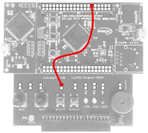 Wir wollen uns den Umstand zu Nutze machen, dass auf dem XMC4500 Zusatzboard die Taster ohne PullUp und Kondensator bestückt sind. Damit können wir den internen PullUp des XMC ausprobieren. Dazu verbinden wir mit einem der Patchkabel den Taster 1 auf dem Zusatzboard mit Pin1.13 des XMC.