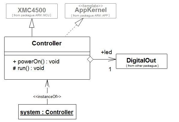 // SiSy UML C++ Codegenerator //////////////////////////////////////////////// class Controller : public XMC4500 // implements AppKernel { public: DigitalOut led; // Aggregation des Bausteins public: Controller(); // automatisch generierter Konstruktor ~Controller(); // automatisch generierter Destruktor void powerOn(); protected: void run(); // aus dem Template AppKernel virtual void startApp(); virtual void onSysTick(); }; ////////////////////////////////////////////////////////////////////////////// // Instanz system der Klasse Controller Controller system; //////////////////////////////////////////////////////////////////////////////