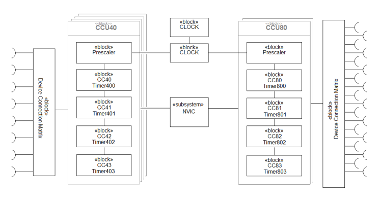 Der XMC verfügt über zwei Timerarten, welche zu Capture/Compare Units zusammengefasst werden, den CCU4 und CCU8. Die CCU8 Timer sind funktional dabei um einiges umfangreicher als die CCU4 Timer. Beim XMC4500 stehen zwei CCU8 (CCU80,CCU81) und vier CCU4 (CCU40-CCU43) zur Verfügung. Jede CCU verfügt wiederum über je vier unabhängige Timer (CCx0-CCx3).