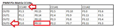 Jeder CC4x Timer besitzt einen PWM Kanal (CCU4x.OUTx). Jeder CC8x Timer verfügt über vier PWM Kanäle (CCU8x.OUTx0 bis CCU8x.OUTx3). Über die Device Connection Matrix können diese auf die entsprechenden Pins geschaltet werden. Die Anzahl der verfügbaren Pins ist von der Gehäuseform abhängig. Die folgende Darstellung zeigt die gewählte Verbindung von P0.12 = CCU40.OUT3 mit einer LED und die PWM-Pin-Matrix der myXMC Referenzkarte mit den verfügbaren CCU4x-PWM-Pins am XMC4500 im 100-Pin Gehäuse.