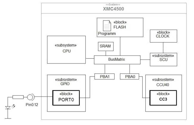 Hier die gesamte Problemstellung noch mal als Blockbild. Es soll der Timer CC43 der CCU40 genutzt werden. Als PWM Kanal wird Pin0.12 (CCU40.OUT03) zugeordet.