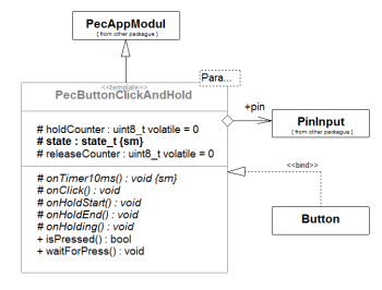 Wir können mit dem, was wir bisher über die UML wissen, bereits ablesen, dass der PecButtonClickAndHold sowie die PecLed über eine Reihe von wichtigen Operationen verfügen und über alle Eigenschaften eines PecAppModul und des PecPinInput bzw. PecPinOutput. Besonders beim PecButtonClickAndHold fällt auf, dass es Operationen gibt, die öffentlich (public) sind.