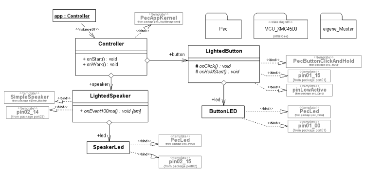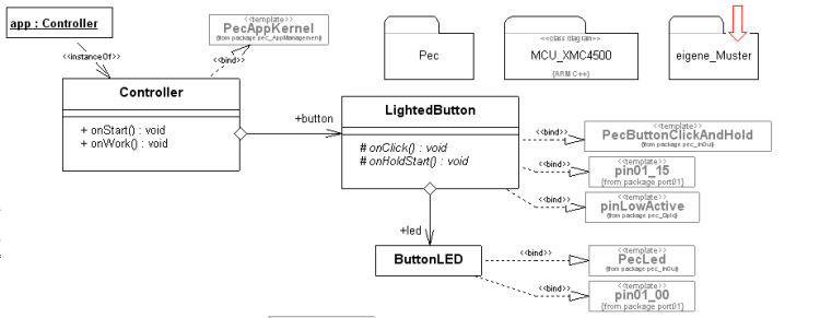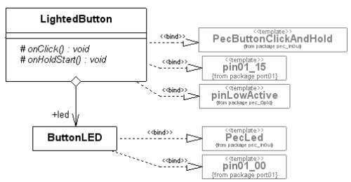 Für die weitere Arbeit können wir auf vorhandene UML-Pakete zurückgreifen (Navigator / UML-Pakete / :Pec / :pec_InOut). Um die vorhandenen Lösungen für unsere neue Komponente wiederzuverwenden, ziehen wir den PecButtonClickAndHold sowie die Led in das Diagramm und verknüpfen diese mit den Bausteinen unserer Komponente. Als Verbindungstyp wählen wir die Realisierung. Die Zuordnung der konkreten Port-Pins erfolgt ebenfalls über Templates, die wir im UML-Ordner pinList finden.