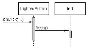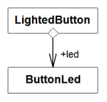 Damit haben wir uns einen kurzen Überblick zu den vorhandenen Lösungen für Taster und LED verschafft. Wir arbeiten in der vorhandenen Diagrammvorlage weiter. Die nächste Überlegung zielt auf die Struktur der Komponente „Taster mit Beleuchtung“. Zunächst geben wir dem Ding einen Namen und legen für den Button eine entsprechende Klasse an: LightedButton. Er hat offensichtlich eine eigene LED. Diesen Umstand würdigen wir mit der Aggregation (Ganz-Teil-Beziehung) einer LED in der Buttonklasse.