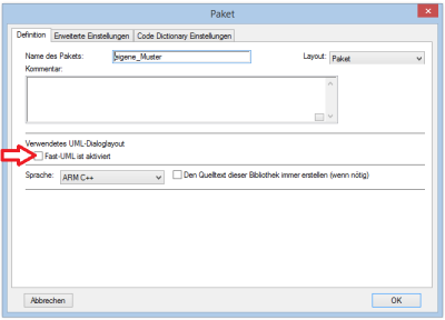 Achten sie darauf, dass die Option „fast UML“ deaktiviert ist. Öffnen Sie das Paket. Laden Sie keine Vorlage aus dem LibStore.