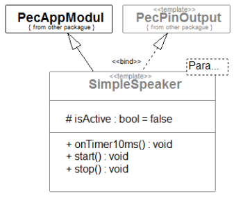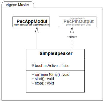 Der einfache Speaker ist ein Ausgabe-Pin und der Einfachheit halber ein PecAppModul. Wir können dann das 10 Millisekunden Ereignis zum Umschalten des Pins benutzen. Der Speaker soll mit der Operation start aktiviert werden und mit der Operation stop wieder angehalten werden. Das Ereignis onTimer10ms des PecAppModuls überschreiben wir.