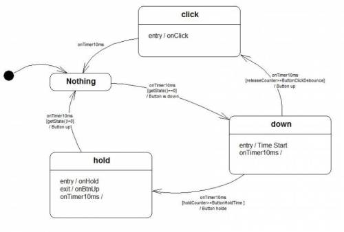 class LightedButton : public PecAppModul // implements PecButtonClickAndHold, pinA00 { protected: PinInput pin; // Attribut from Template PinInput protected: ButtonLed led; // Aggregation from Model protected: uint8_t volatile holdCounter; // Attribut protected: uint8_t volatile releaseCounter; // Attribut protected: state_t state; // Attribut for State Machine enum{ state_state_Nothing=1, state_state_down, state_state_click, state_state_hold }; // States for State Machine public: bool isPressed(); // Operation from Template ButtonClickAndHolde public: void waitForPress(); // Operation from Template public: virtual void config(...); // Operation from Template PinInput public: virtual bool getState(); // Operation from Template PinInput public: void changeState_state(state_t newState); // Operation from State Machine public: LightedButton(); //Konstruktor public: ~LightedButton(); //Destruktor protected: void onClick(); // Operation from Template ButtonClickAndHolde protected: void onHoldStart(); // Operation from Template ButtonClickAndHolde protected: virtual void onTimer10ms(); // overwritten Operation from Base Class AppModul protected: virtual void onHoldEnd(); // Operation from Template ButtonClickAndHolde protected: virtual void onHolding(); // Operation from Template ButtonClickAndHolde };