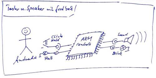 Es ist eine Mikrocontrolleranwendung zu entwickeln, bei der mit einem Taster ein Speaker angesteuert wird. Dabei sollen Taster und Speaker über optische Rückmeldungen verfügen. Im ersten Schritt ist die Lösung für einen „beleuchteten Taster“ zu entwickeln. Das optische Feedback soll über eine zugeordnete LED realisiert werden. Diese hat die Verarbeitung verschiedener Tasteraktionen durch kurzes Aufblitzen anzuzeigen. Zunächst sollen die Aktionen Klicken und Halten als erkannt optisch zurückgemeldet werden. Im zweiten Schritt ist der Speaker zu realisieren. Diesem ist eine LED zuzuordnen, welche solange blinkt, wie der Speaker aktiv ist. Durch das Klicken des Tasters soll der Speaker aktiviert werden. Das Halten setzt den Speaker wieder zurück.