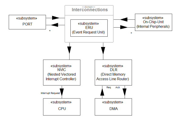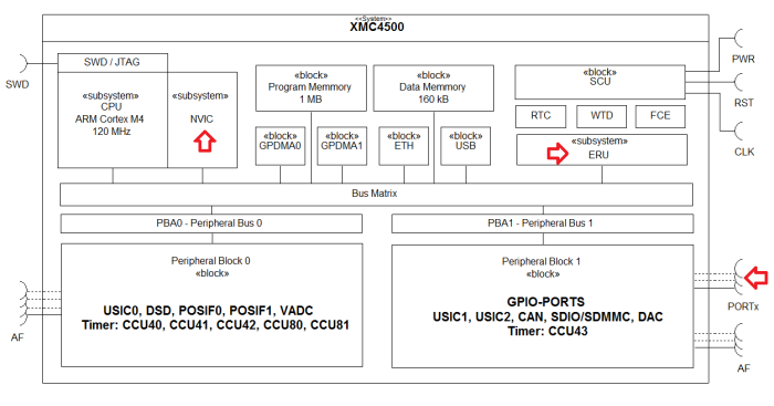 Die Controller der XMC-Familie verfügen über sehr leistungsfähige Bausteine für das Management von mehr als 100 verschiedenen Systemereignissen. Theoretisch kann ein ARM über seinen Standard Interruptcontroller NVIC bis 240 Ereignisse verwalten. Mit dieser Menge an möglichen Interrupts und seinem praktisch im Kern eingebetteten schnellen Interruptcontroller, kann ein Cortex M vor lauter Unterbrechungskraft sowieso schon kaum laufen. Die Auswahl und Konfiguration konkreter Interrupts kann für den XMC-Entwickler aber recht kniffelig werden. Neben dem NVIC (Nested Vectored Interrupt Controller) verfügt der XMC noch über eine komplexe Event Request Unit (ERU). Diese verknüpft Systembausteine mit dem NVIC und dem DMA-Line-Router, aber auch die Systembausteine untereinander.