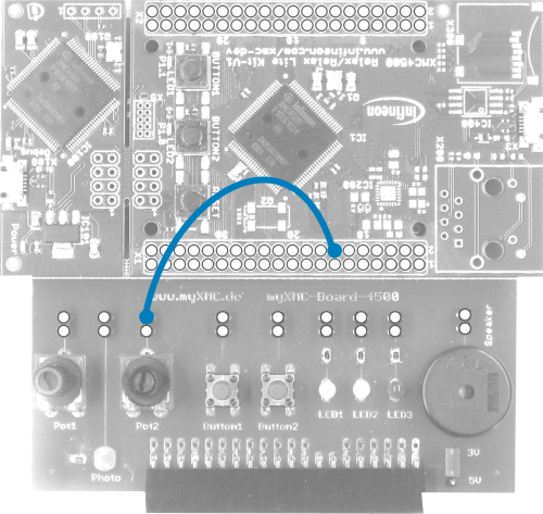 Verbinden Sie die USB-UART-BRIDGE auf dem Erweiterungsboard mit dem PC und patchen Sie das Potentiometer auf Pin14.0 (vgl. Bild). Starten Sie das ControlCenter und beachten die korrekten Einstellungen für den COM-Port. Nachdem Sie die Verbindung mit geöffnet haben stellen Sie die Ansicht auf „Oszi“ um. Sie können über die Optionen für die Oszi-Ansicht verschiedene Darstellungsvarianten auswählen. Nun können Sie jede Veränderung am Potentiometer auf dem Bildschirm verfolgen.