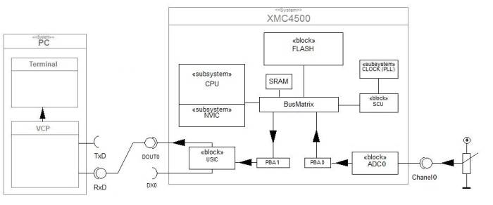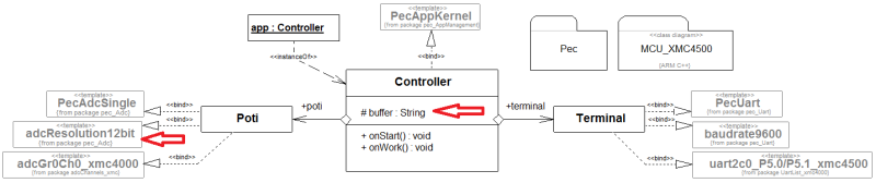 Die verfügbaren Klassen PecAdcSingle und PecUart finden wir, wie schon gesagt, über den Navigator in den UML-Paketen. Inzwischen wissen wir, wie aus den Basisklassen und zuordenbaren Templates konkrete Komponenten zusammengesetzt werden können. Für die UART nutzen wir wiederum die Pins P 2.14 und P 2.15. Dabei reicht es eigentlich, wenn wir nur die Sendeleitung P 5.0 mit RxD verbinden, da wir keine Daten empfangen. Für die Erfassung des Analogwertes verbinden wir eines der Potentiometer auf dem Erweiterungsboard mit ADC 0, Chanel 0 als Alternativfunktion des Pin 14.0 (vgl. ADC Pin Mapping).