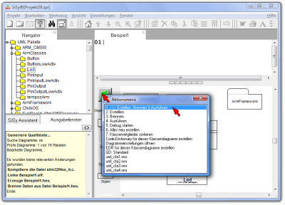 Falls Sie jetzt noch das Klassendiagramm geöffnet haben, wählen Sie im Kontextmenü (rechte Maustaste) des Diagramms den Menüpunkt nach oben. Falls das Projekt nicht mehr geöffnet ist, öffnen sie das SiSy UML-Projekt wieder. Legen Sie ein neues Klassendiagramm an und wählen Sie die Sprache ARM C++. Beachten Sie die Einstellungen für die Zielplattform XMC4500 Relax Kit. Beim Öffnen des Diagramms (rechte Maustaste, nach unten) laden Sie die Diagrammvorlage für eine PEC Applikation und fügen das Treiberpaket für den XMC4500 ein.